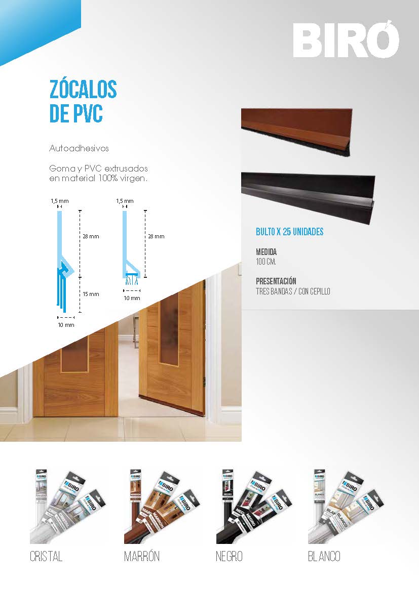 Materiales: Goma y PVC extrusados en material 100% virgen. Medidas: 1 Metro Colores: NEGRO - MARRÓN - BLANCO - CRISTAL Presentación: En Bultos x 20 unidades.
